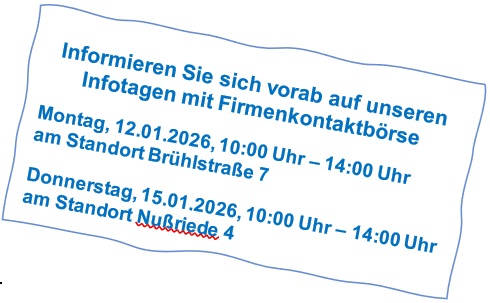 - Bitte beachten Sie, dass Ihre Anmeldeunterlagen an den oben angegebenen Terminen zwar an beiden Standorten entgegengenommen werden, dass es aber für den Bildungsgang BFS dual nicht möglich ist, sich für einen konkreten Standort – Brühlstraße oder Nußriede – zu bewerben.