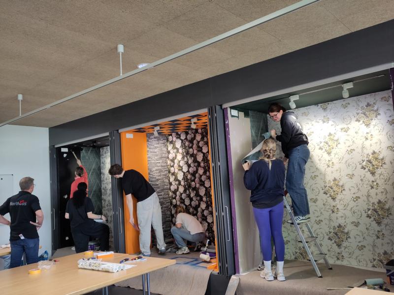 Gestalter für visuelles Marketing nehmen an Fachseminar „Tapeten verarbeiten“ teil